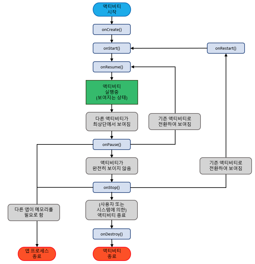 - (사용자가 활동을 완전히 닫거나 활동에서 finish()가 호출되어) 활동이 종료되는 경우